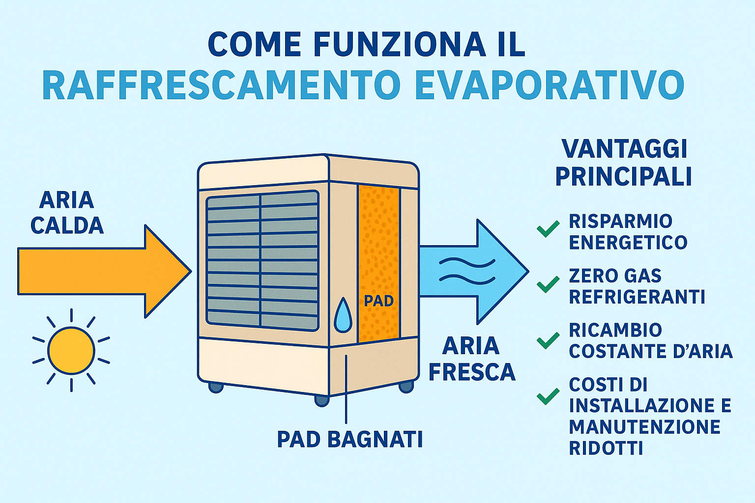 È una tecnologia che sfrutta un principio naturale: l’evaporazione dell’acqua abbassa la temperatura dell’aria. I raffrescatori evaporativi aspirano l’aria calda dall’esterno, la fanno passare attraverso speciali pannelli bagnati (pad), e la reimmettono all’interno più fresca e pulita.